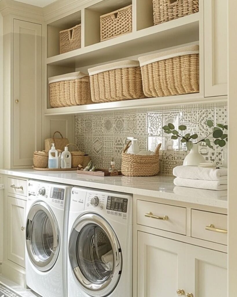 Baskets and bins: Use them to sort laundry by color (lights, darks, delicates) or by person if you’re doing laundry for a family. Label them so everyone knows where their stuff goes.
