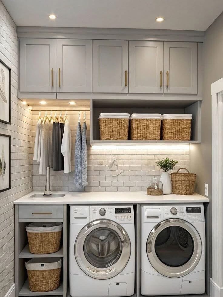 Upper cabinets or shelves: Perfect for storing detergent, stain removers, dryer sheets, and other supplies. Wall-mounted shelves are easy to install and make a huge difference.