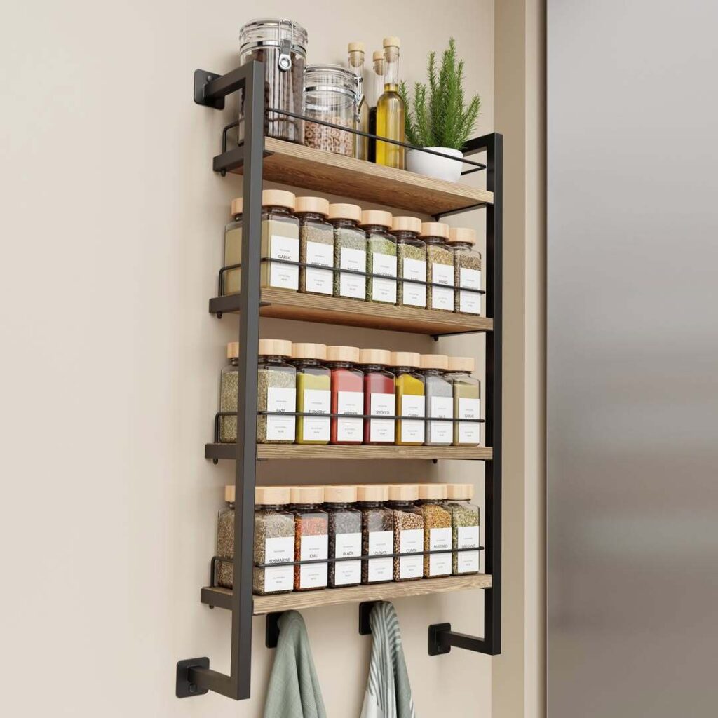 Spice racks: Traditional wooden or metal spice racks that mount to the wall.
