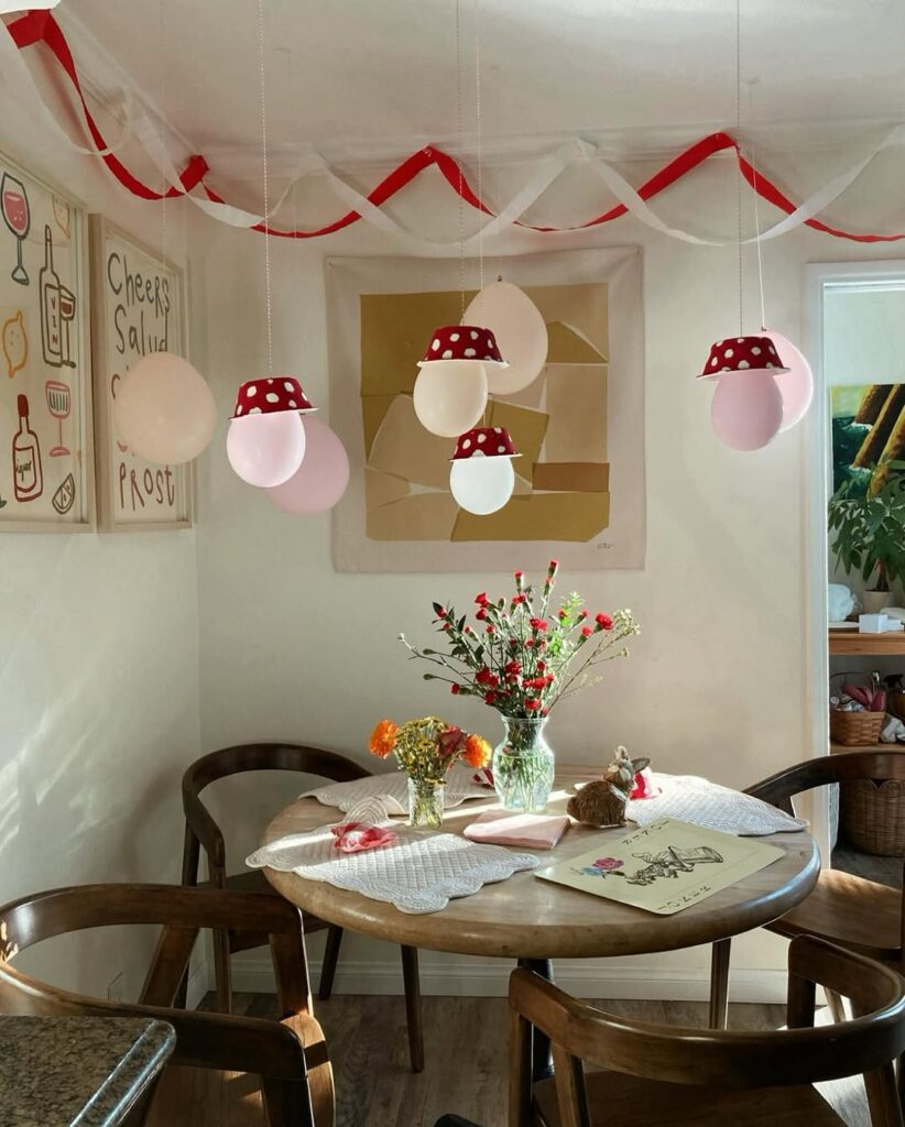 If you have outdoor space or even just a corner of your party area, create a rose garden. Use red and white roses (real or fake). Paint white roses red with red paint visibly dripping for that Queen of Hearts effect. Add some oversized mushrooms made from paper or foam. Scatter flamingo decorations around. If you’re feeling ambitious, create giant flower props from poster board.