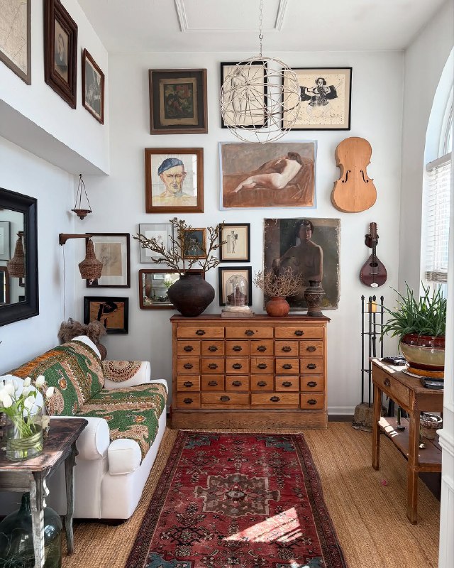 Large-scale textile art like a vintage rug, tapestry, or macramé hanging becomes a focal point. These soften walls and add significant texture.