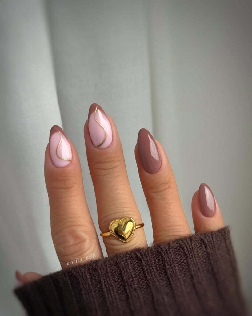 Pair brown with gold for an incredibly chic combination. Paint most nails in a chocolate or caramel brown, then add gold to one or two accent nails.