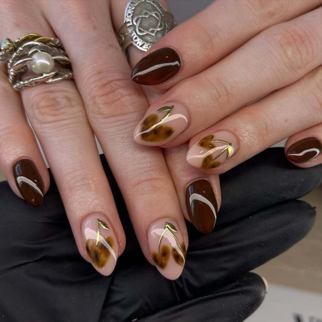 Create simple patterns like French tips where the tip is brown and the base is cream, or reverse it. You can also do minimalist line art in cream on a brown base—think simple flowers, dots, or geometric shapes.