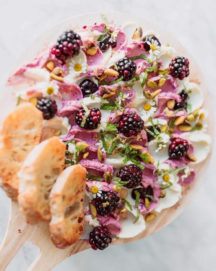 Take your butter to the next level by browning it first in a pan with fresh sage leaves until it’s nutty and fragrant. Let it cool slightly but keep it spreadable, then pour it onto your board with the crispy sage leaves on top. Add some grated parmesan and cracked black pepper. This one’s elegant and perfect for dinner parties.