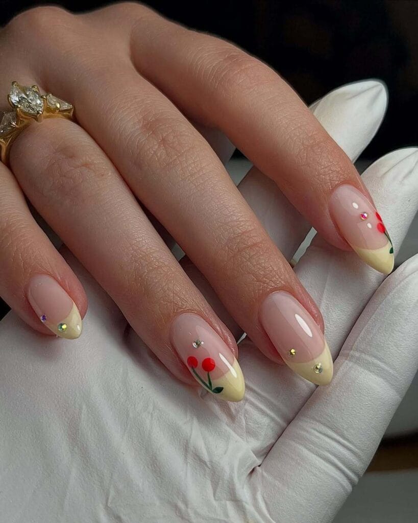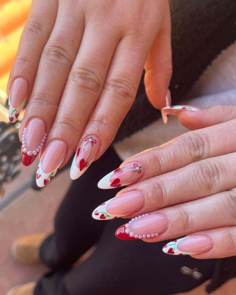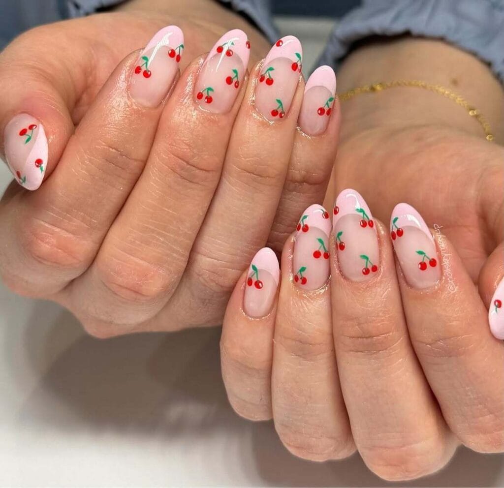 French Cherry Tips Do a reverse French with red tips and nude/pink base. Add tiny cherry dots at the base of each nail. This one’s perfect if you want something subtle for work but still on-trend.