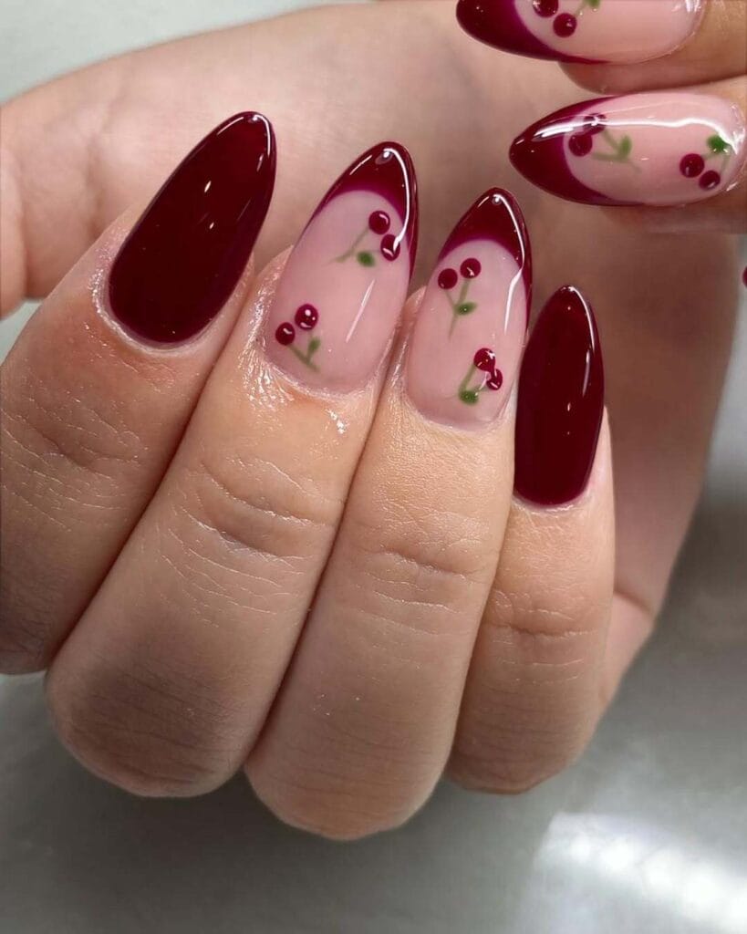 Gradient Cherry Vibes Create an ombré from light pink to deep red, then add cherry accents on one or two nails. It’s giving sunset cherry orchard and I’m living for it.