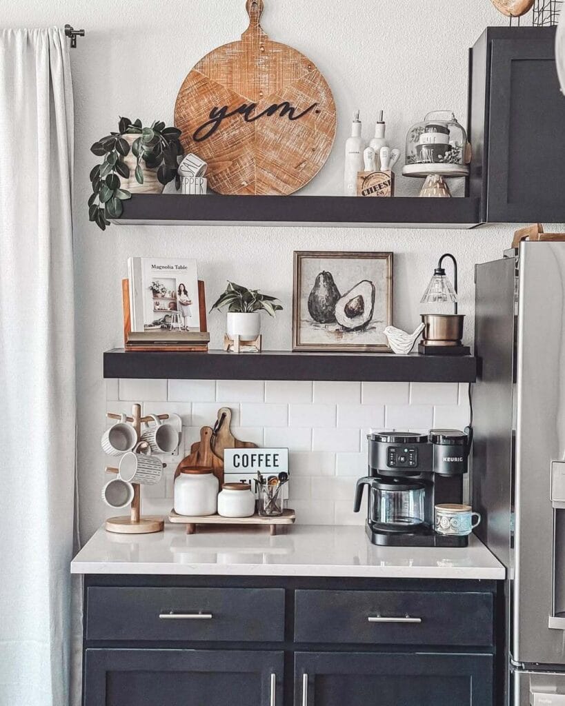 I love using a wooden tray to corral everything – it makes the whole setup look cohesive and you can easily move everything when you need to clean. Add a small plant (pothos are basically unkillable), a pretty dish for sugar packets, maybe a small sign or piece of art that makes you smile.