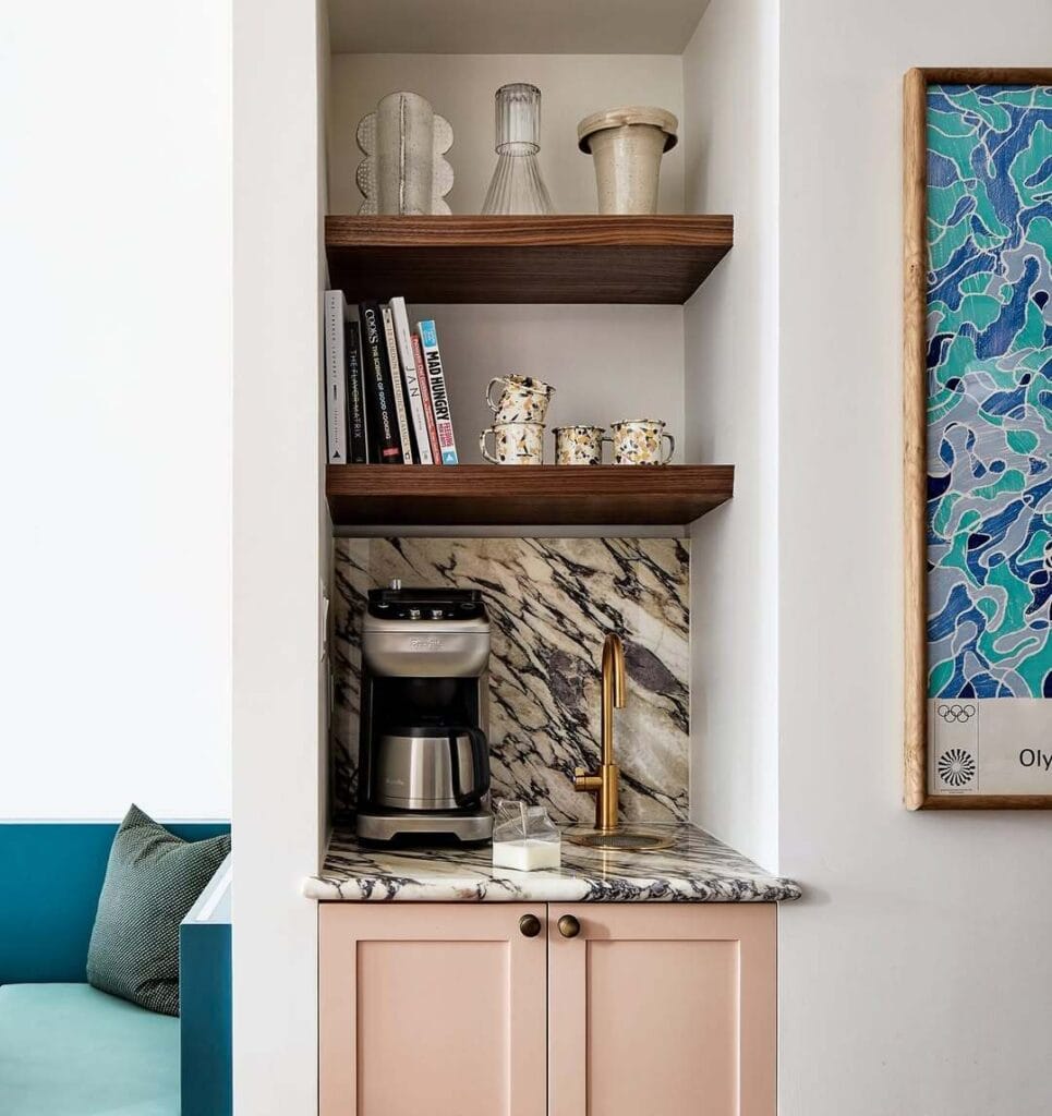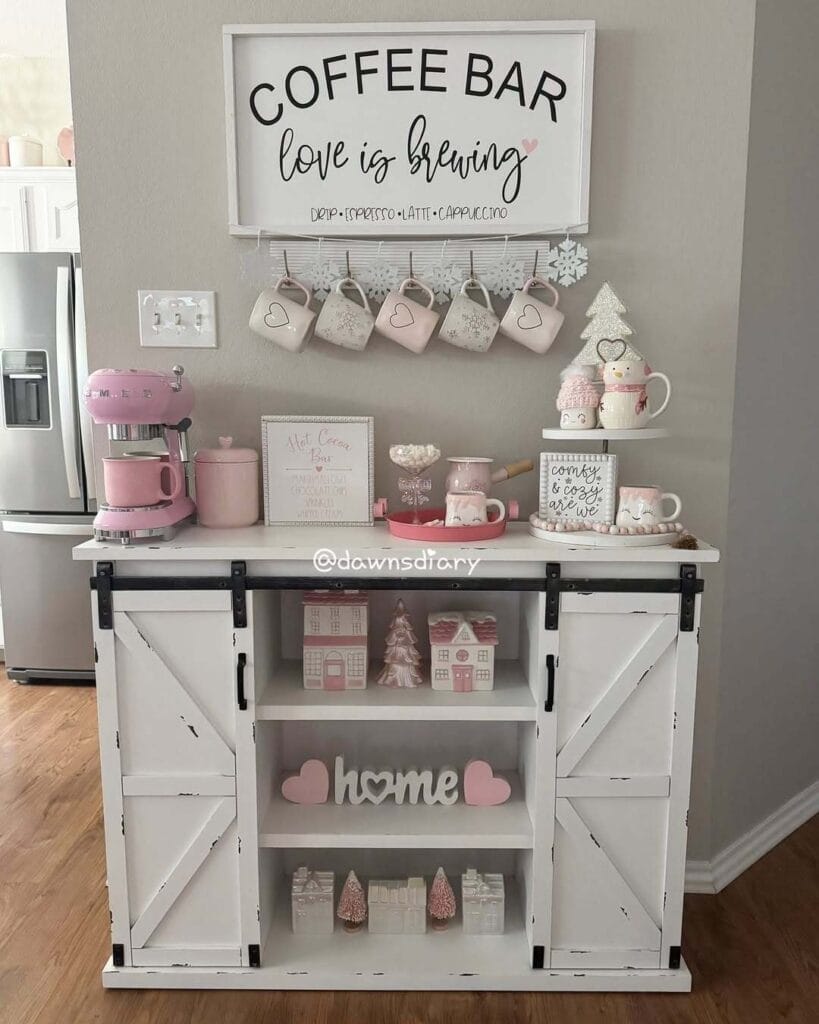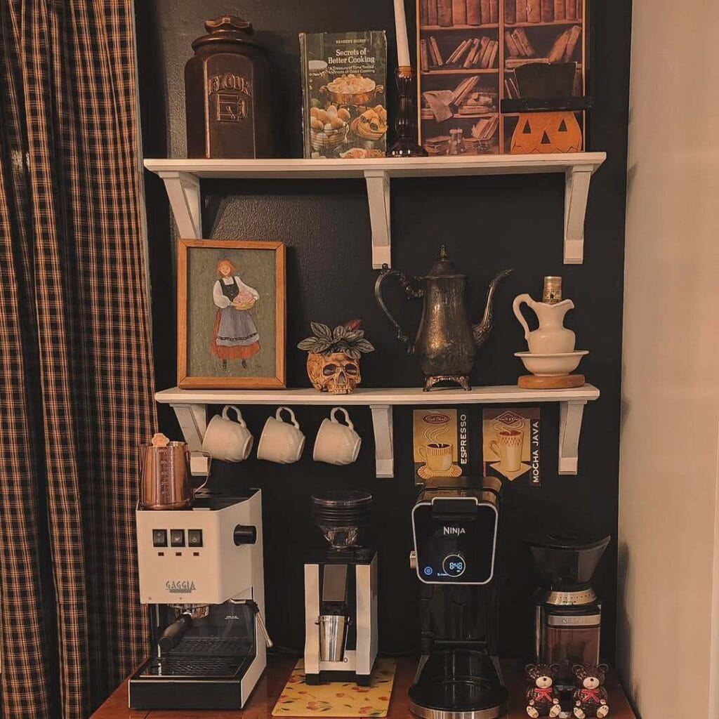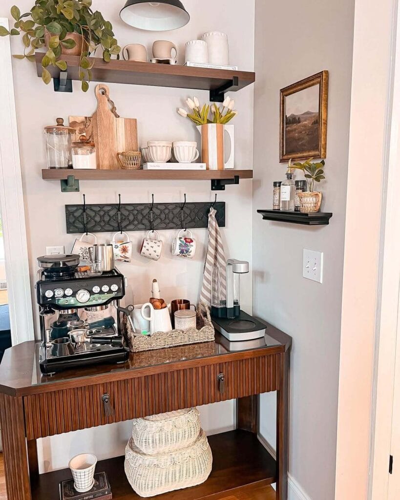 The secret to an aesthetic coffee bar is creating little vignettes that look intentional. Group things in odd numbers, play with heights using small stands or books, and don’t be afraid of negative space. Sometimes less really is more.