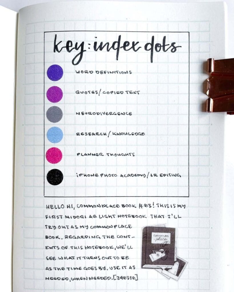 - Organize with Categories: Divide your journal into categories based on themes that resonate with you. Examples include Quotes, Personal Reflections, Wisdom from Books, Inspirational Stories, and Ideas for Creativity. What works really well is to have a color key (like stickers) so when you flip through the journal you can quickly see the color and therefore the category/topic.