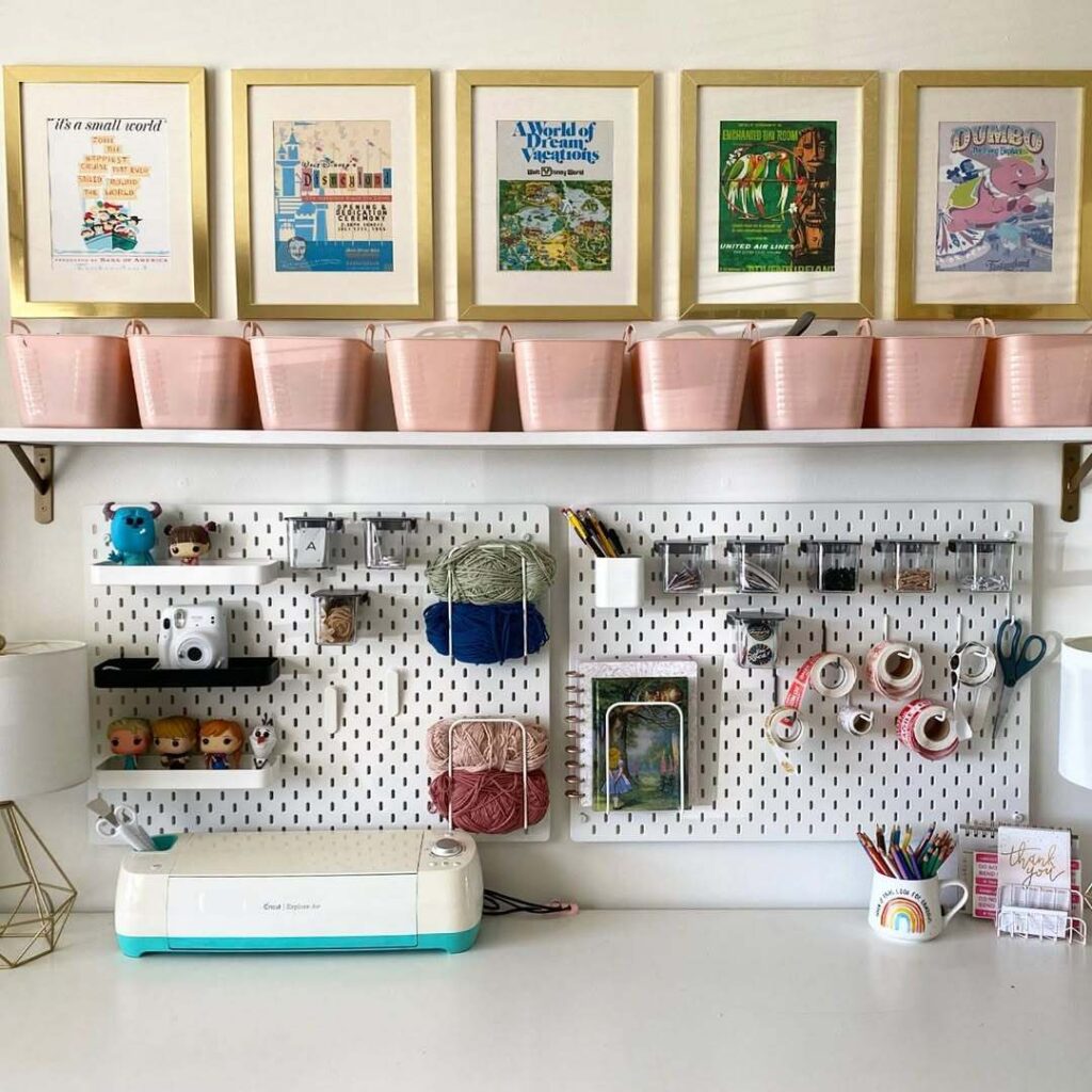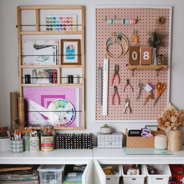 Wall-mounted pegboard: One of the most versatile craft storage solutions. Hang tools, scissors, ribbons, and frequently used supplies. Customize with hooks, baskets, and shelves.