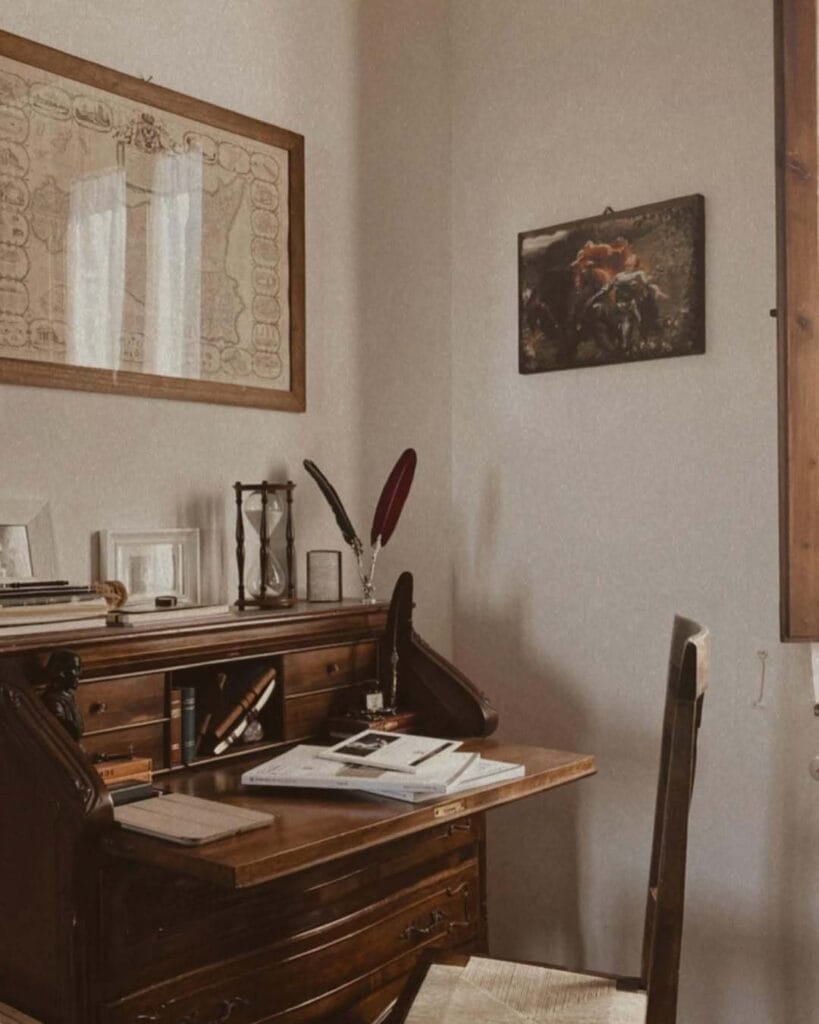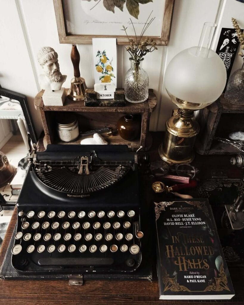 Writing desk: A dedicated desk for writing, studying, or creative work is central to the dark academia vibe. Add a desk lamp, pen holder, and some old books.