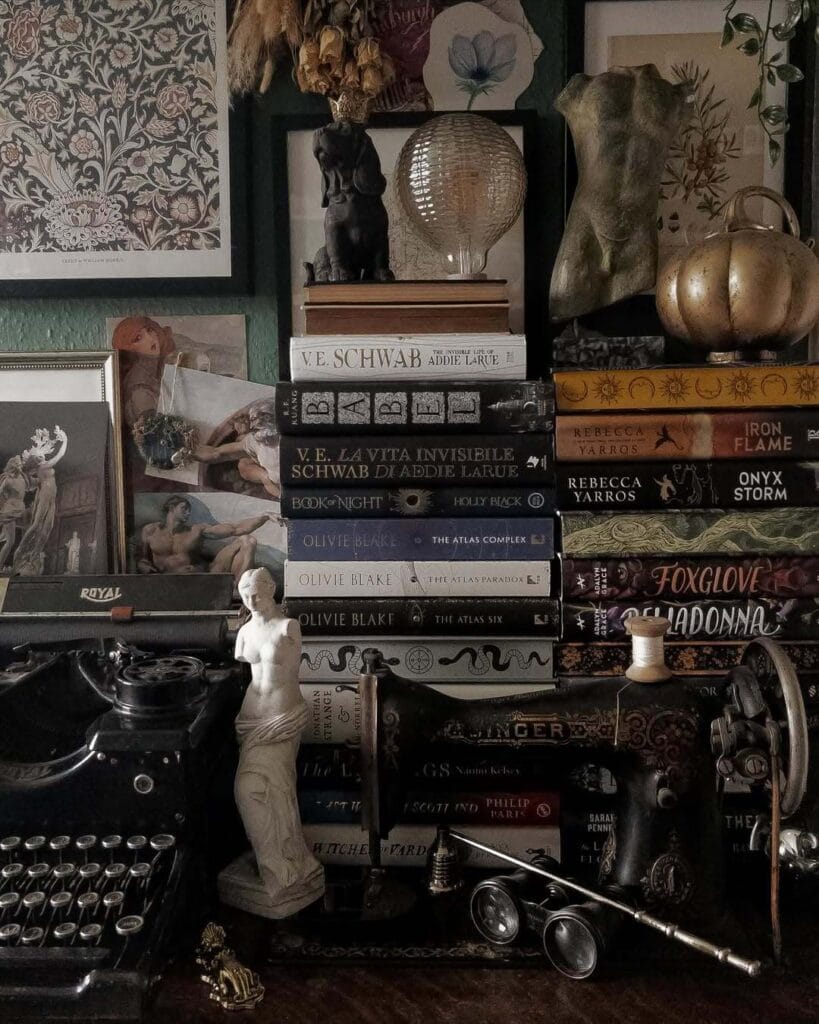 Books are absolutely essential to dark academia decor. They’re not just for reading—they’re part of the aesthetic.