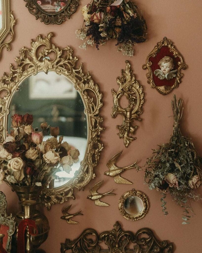Mirrors: Ornate vintage mirrors in gold or dark wood frames add depth and elegance.