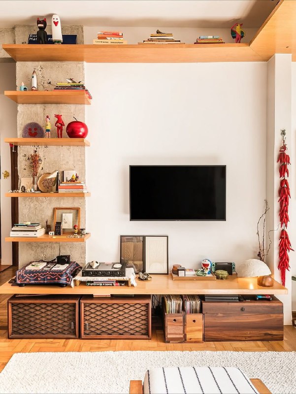 Floating shelves above and/or beside create display space without drilling tons of holes. Shelves above the TV hold plants, books, or decorative objects. Shelves on either side create a built-in look and provide functional storage.
