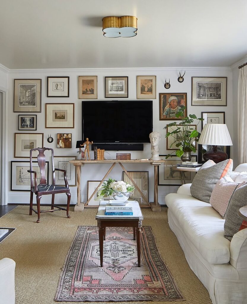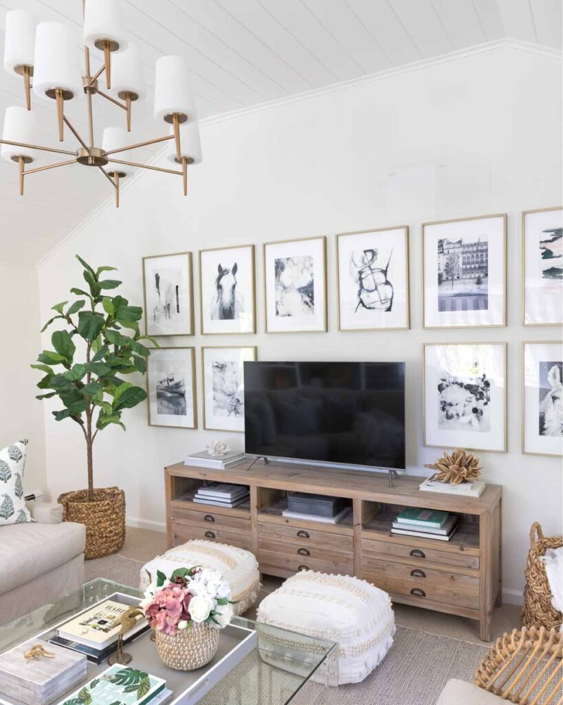 If space is limited, keep the wall above the TV clear. A busy wall above a TV feels cramped and chaotic.