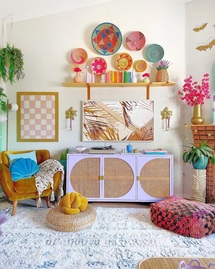 Bohemian eclectic layers plants, textiles, collected objects, and mixed art styles for a rich, lived-in look.