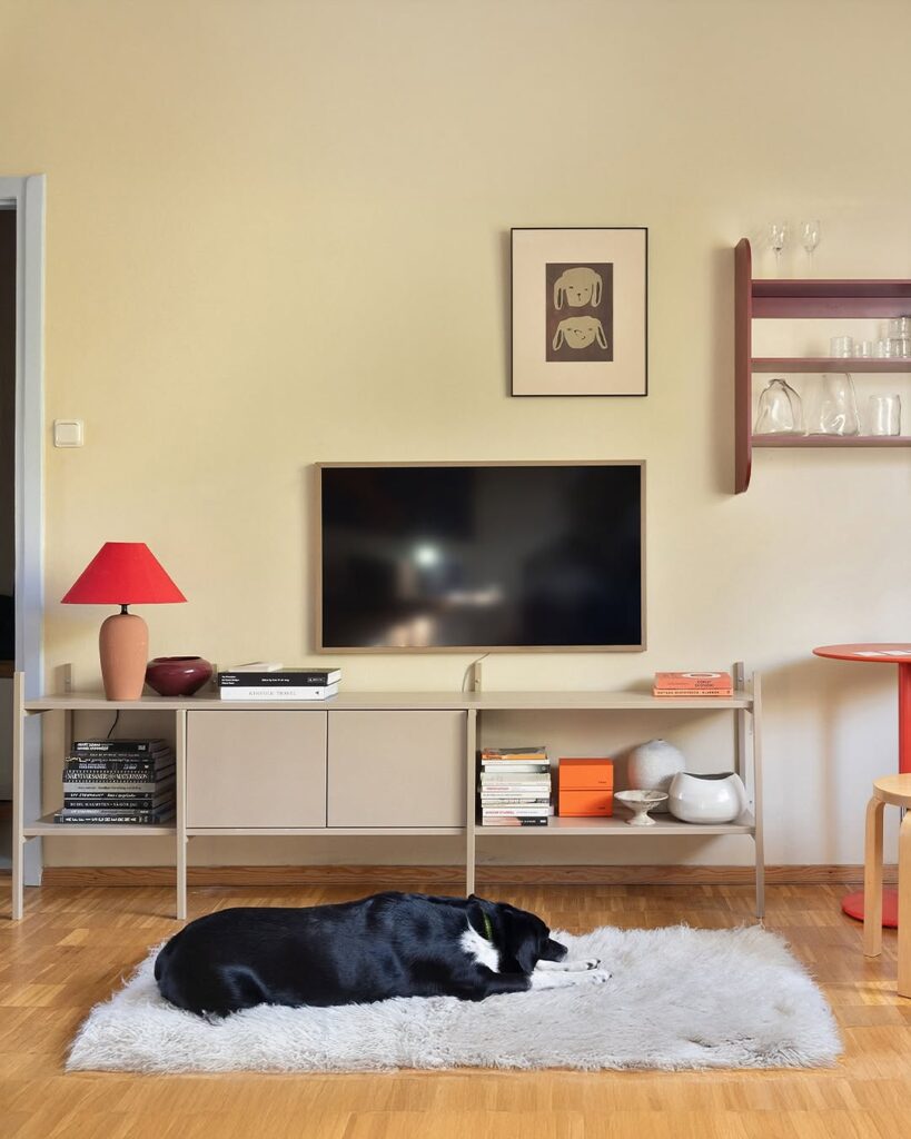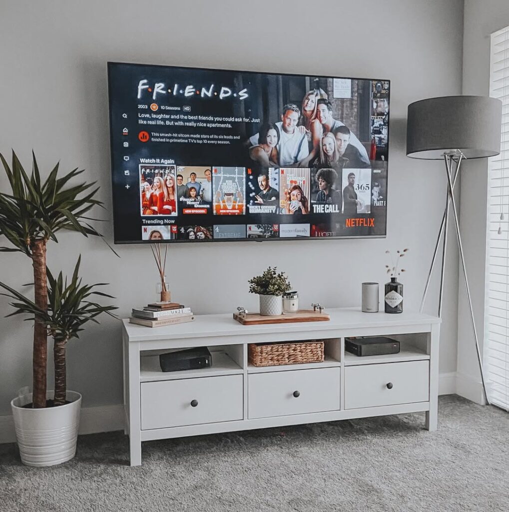 I have a tall snake plant on one side of my TV, a medium-sized plant on the other, a small stack of books, and a decorative box for remotes. That’s it. Simple but the TV no longer looks like it’s floating in a void.