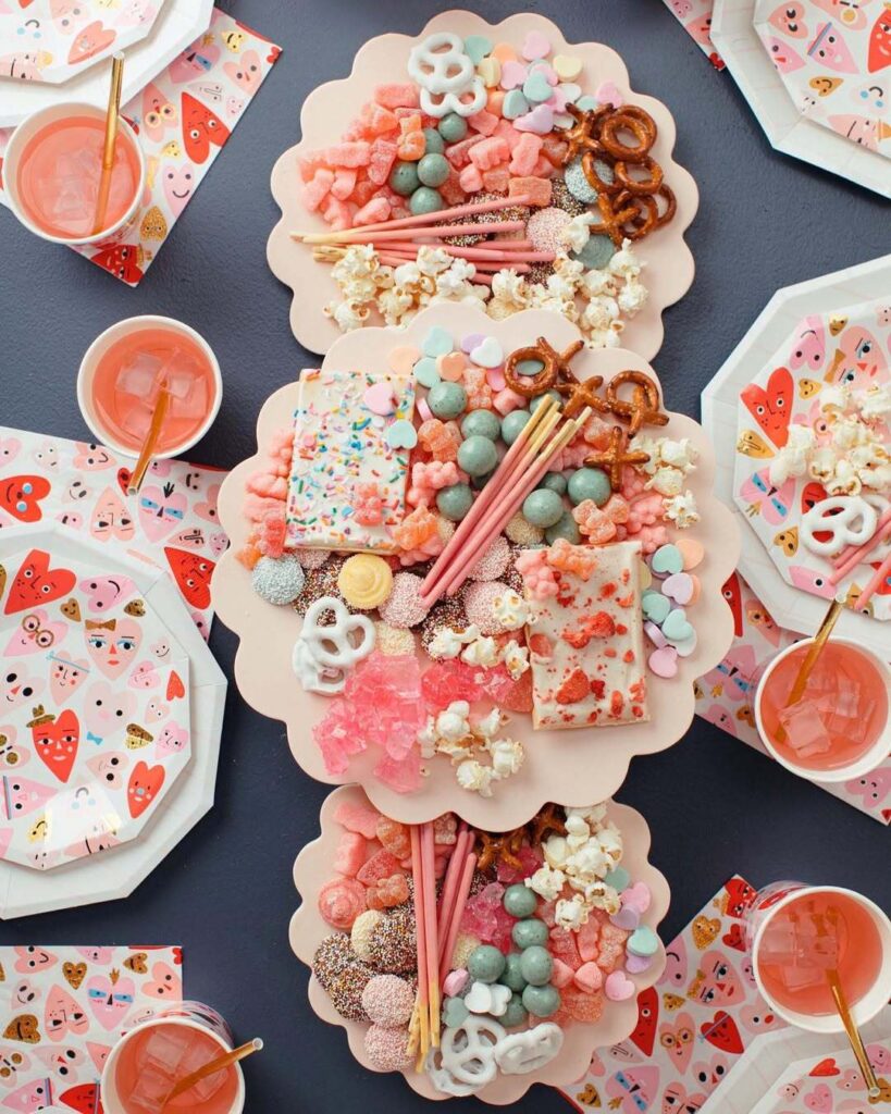 All pink and red everything: strawberries, raspberries, pink frosted cookies, conversation hearts, red velvet cake bites, chocolate-covered strawberries, macarons, red licorice, and heart-shaped chocolates. Corny? Maybe. Cute? Absolutely.
