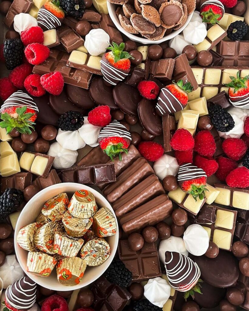 All chocolate everything. Dark chocolate squares, milk chocolate truffles, white chocolate bark, chocolate-covered strawberries, chocolate cookies, Ferrero Rocher, chocolate-covered pretzels, and a bowl of melted chocolate for dipping. Add some raspberries for color and to pretend it’s balanced.