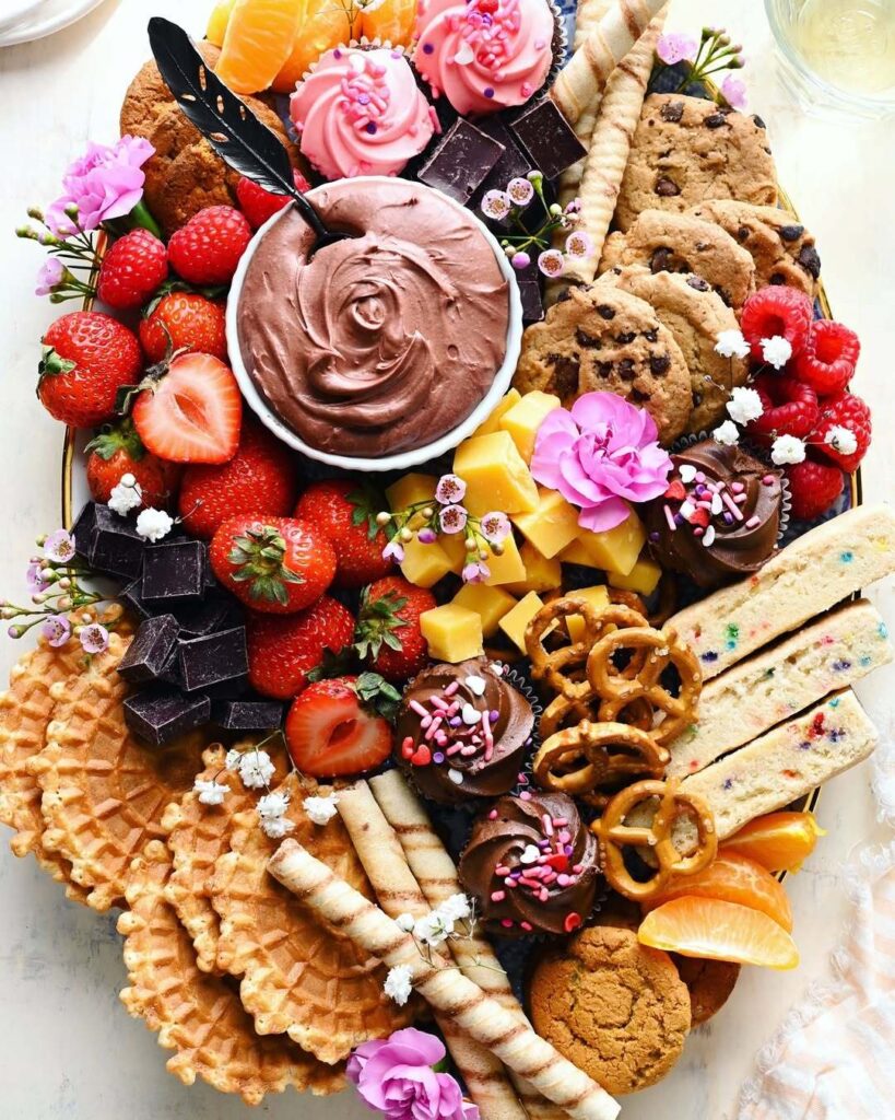 Macarons, chocolate-dipped biscotti, fresh figs, berries, dark chocolate squares, candied nuts, shortbread cookies, tiny tarts, and edible flowers for garnish. This one says “I’m sophisticated” even though you bought most of it at Trader Joe’s.
