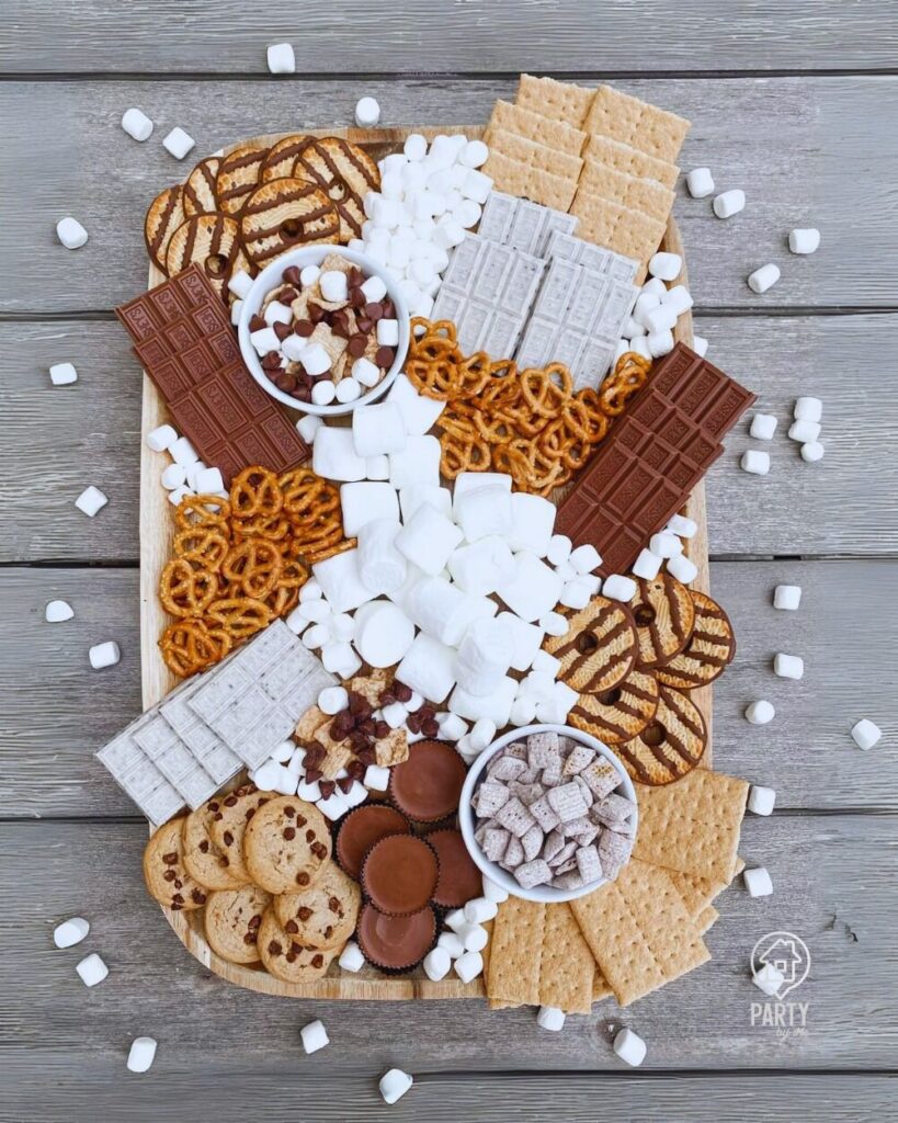 Graham crackers (regular and chocolate), marshmallows (regular, flavored, and jumbo), chocolate bars broken into pieces, Reese’s cups, caramel squares, strawberries, bananas. Add some Nutella on the side. You can toast marshmallows at the table with a small kitchen torch if you’re feeling fancy.