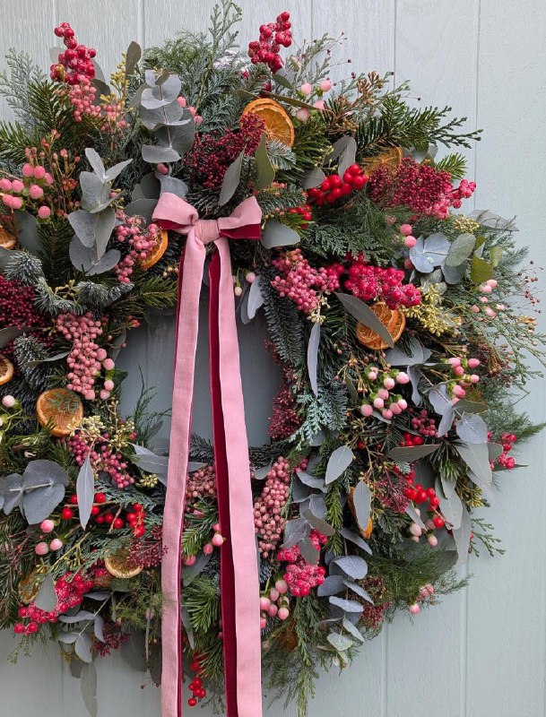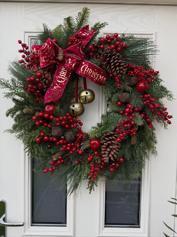How: Attach greenery to the base (hot glue or wire), add pinecones and berries throughout, finish with a big bow.