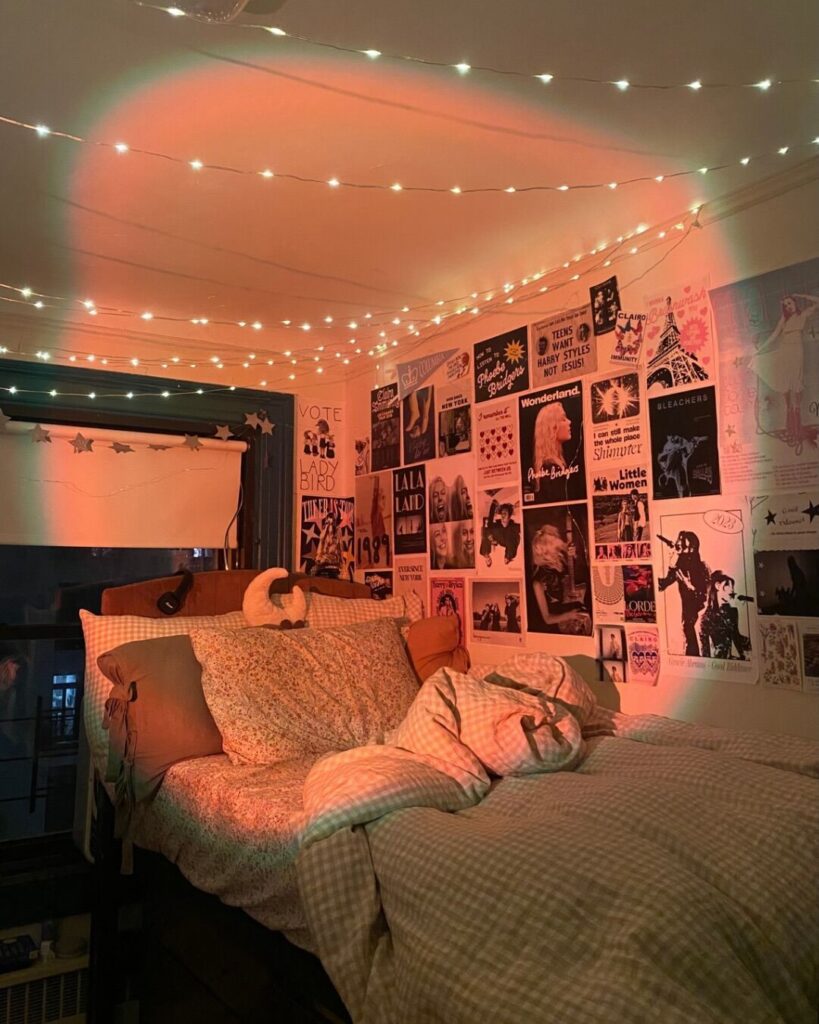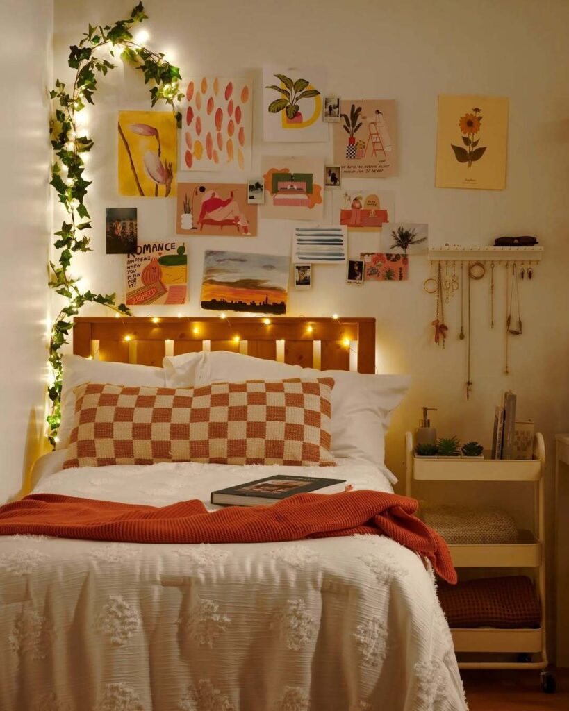 Photo Walls and Collages Print photos of friends, family, places you love, and create a collage arrangement. Use washi tape, command strips, or photo hanging clips with string lights. Makes the space feel personal immediately.