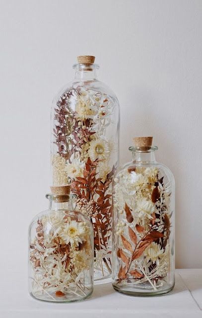 Another elegant idea is to fill dried flowers in a bottle. This decorative piece is also super handy as you will not have to deal with falling leaves.