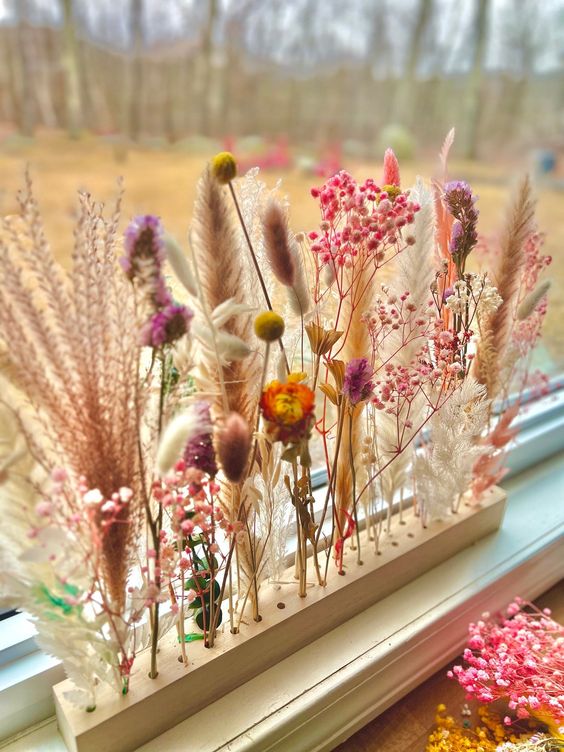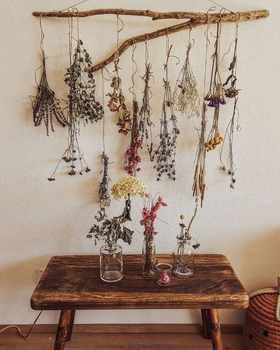 Drilling some holes in a bar and sticking dried flowers inside gives a beautiful decoration piece. Place it infront of a window or in the center of a table!