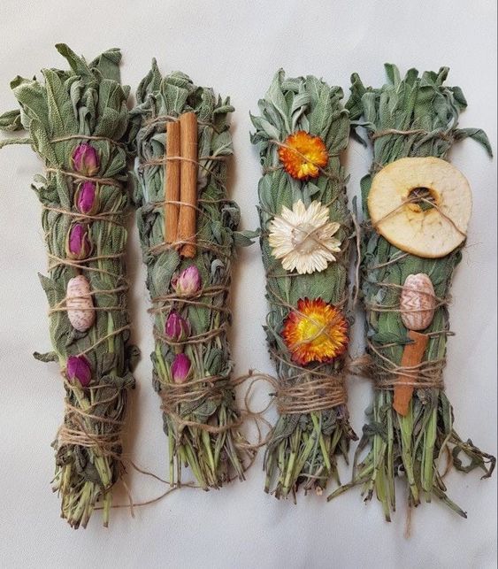 use dried flowers and herbs in combination with sage or pine or other good smelling plants to create your very own smudging sticks.