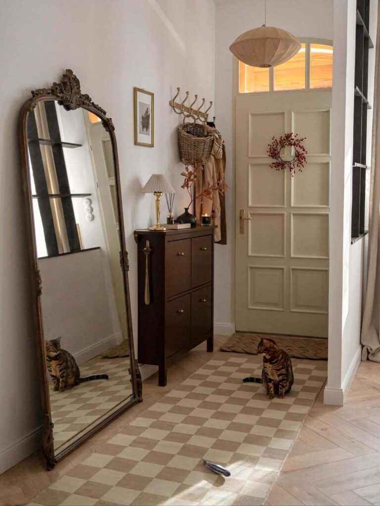 Create a mini entry zone even in an open space. Use a runner rug to define the entry area, add a wall-mounted hook strip, and call it your entryway. The rug creates a visual boundary that says “this is the entry” even without walls.