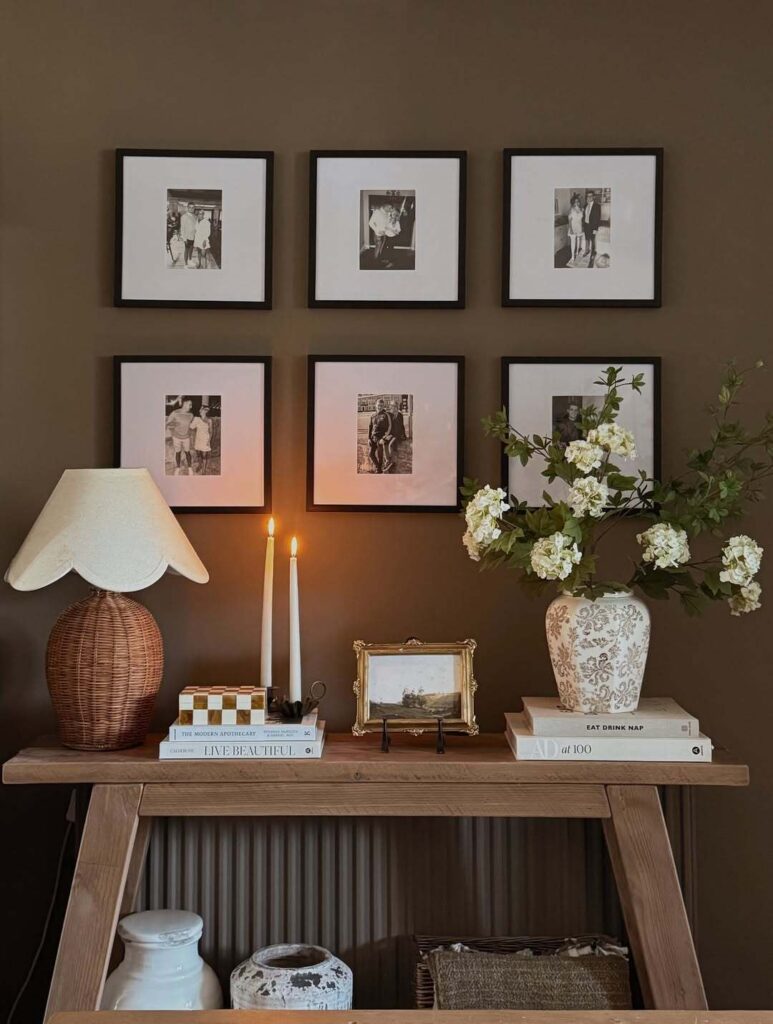 I keep mine pretty simple: a wooden tray with a small dish for keys, a table lamp, a small plant, and usually one seasonal element. It’s functional but still looks styled.