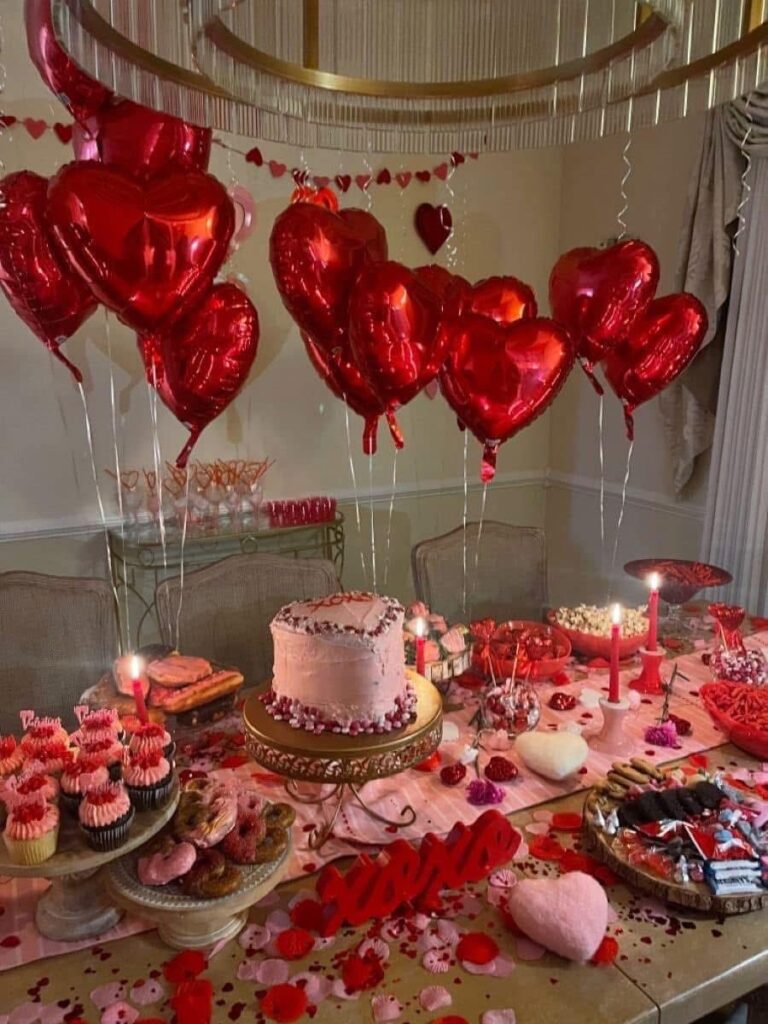 - Balloons: Create a balloon garland or scatter heart-shaped balloons around the party area.