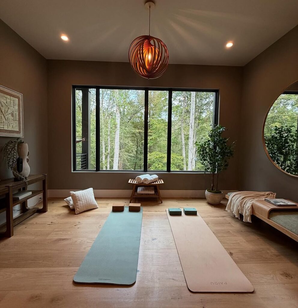 The Bedroom Nook Actually makes a lot of sense since meditation and yoga practice can support better sleep. A corner of the bedroom with your mat, a few cushions, and some soft lighting creates a natural wind-down zone.