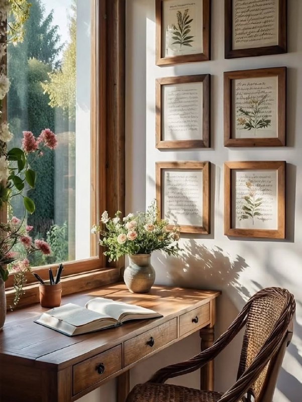Inspiration board or wall space displays notes, quotes, pressed flowers, photos, or postcards. A cork board covered in cream fabric or a simple arrangement on the wall above your desk keeps inspiration visible.