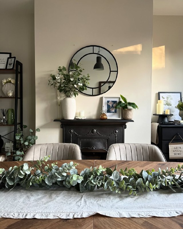 Greenery brings life and natural elements. Fresh flowers, potted plants, faux greenery, or seasonal branches all soften the space.