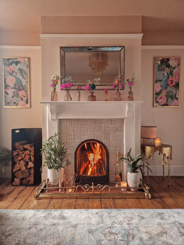 No mantel at all can still have styling on the wall and floor around the fireplace using the same principles.