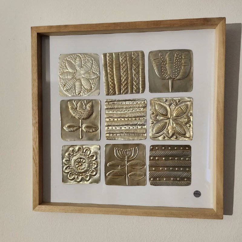 Finishing options: Leave the metal natural and shiny, apply patina for an antique look, or paint the recessed areas with acrylic paint for contrast. Frame the finished piece or mount on a backing board.
