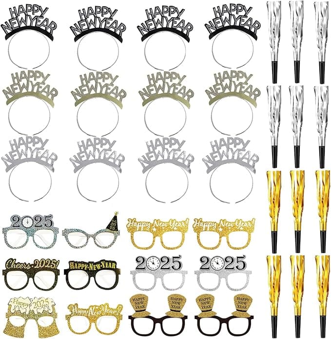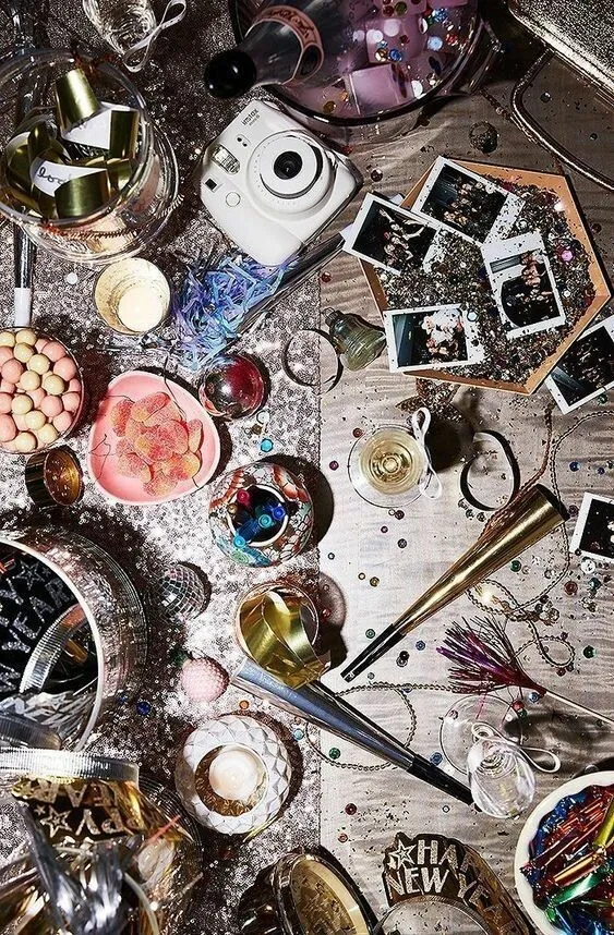 - Photo Booth and Backdrops: A photo booth with New Year’s-themed props like champagne glasses, hats, and 2024 glasses is a must. Create a backdrop with tinsel curtains or a DIY wall of streamers for memorable pictures.