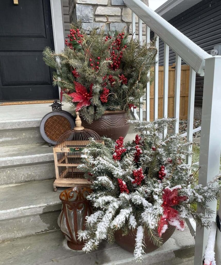 Evergreen arrangements: Fill planters with evergreen branches, red or white dogwood branches, and birch logs. Add oversized ornaments or berry picks for pops of color.