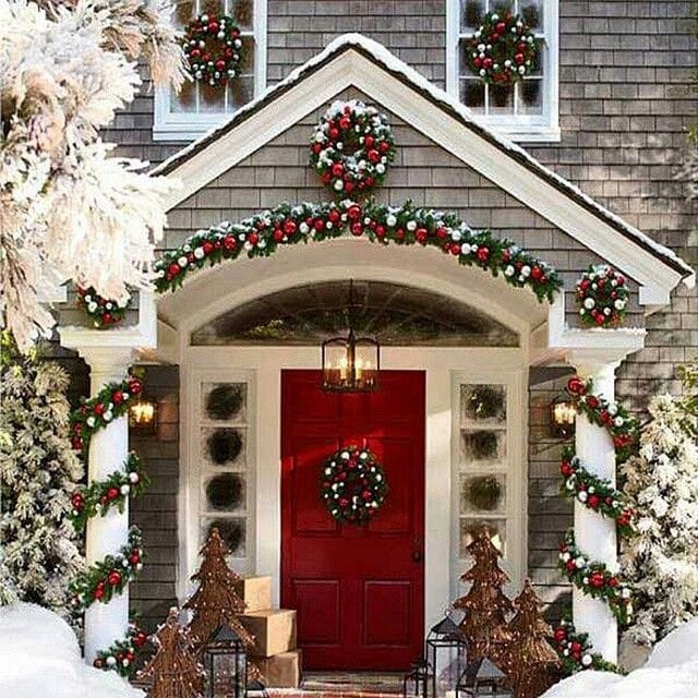 Front door wreath: A beautiful wreath on your front door is welcoming and festive. Choose fresh evergreen for that amazing scent, or go with high-quality artificial that you can use year after year. Add a big bow, pinecones, berries, or ornaments.
