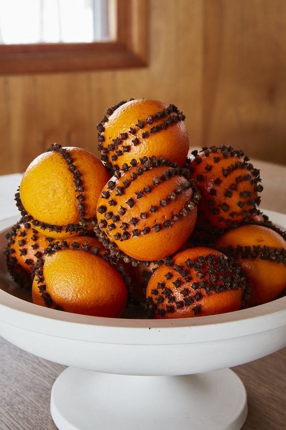 - Take a fresh orange or other citrus fruit and stud the skin with whole cloves in patterns such as spirals, stars, or even simple lines.