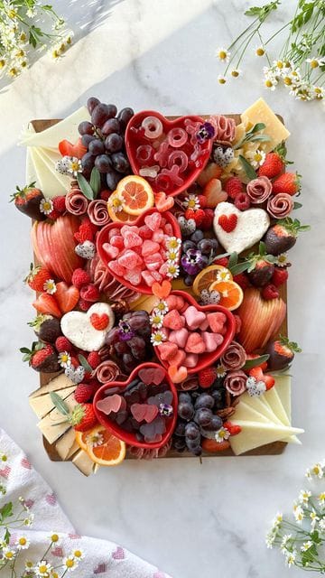 A heart-shaped serving board instantly sets the mood. If you don’t have one, arrange the items on a circular or rectangular board, using heart-shaped cookie cutters to guide the layout or create a heart outline with small bowls or ingredients.