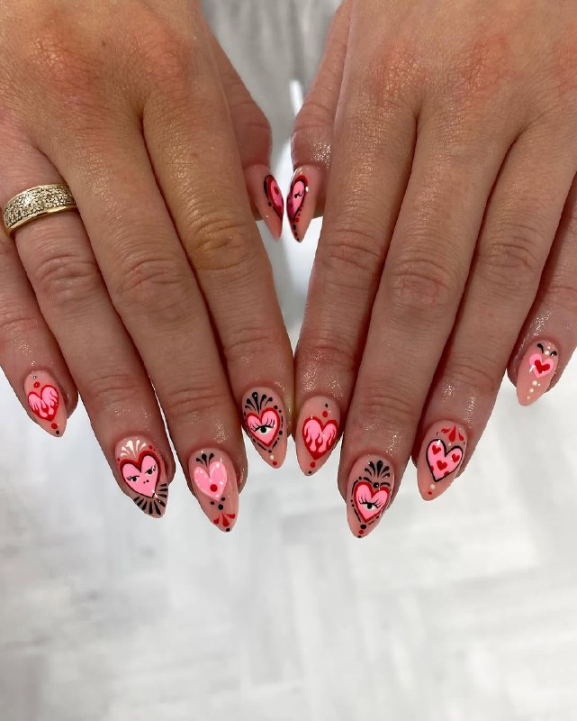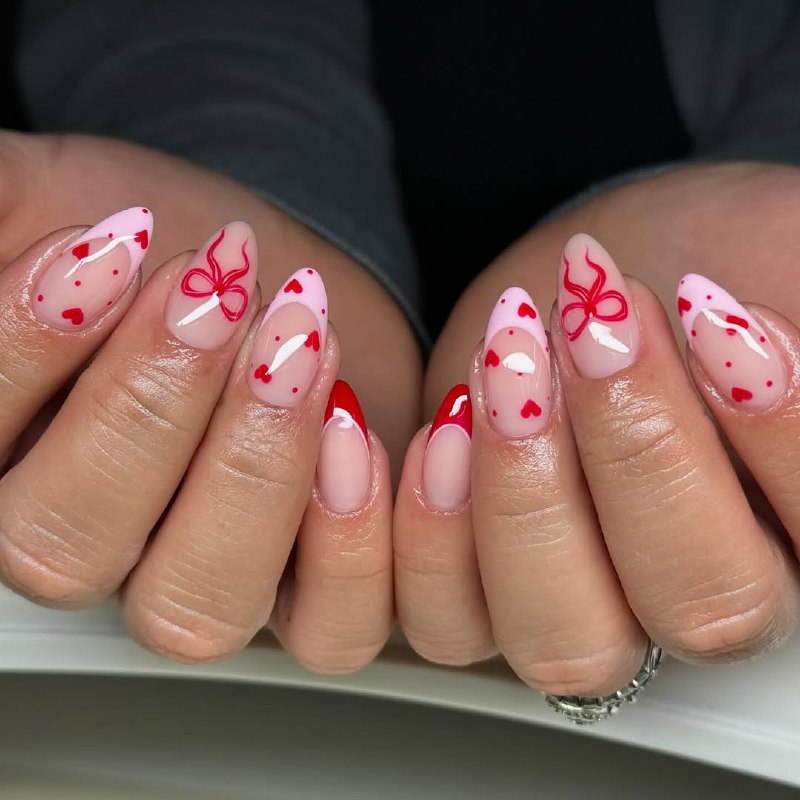 Black nails with red accents, or vice versa. You can do alternating colors, black with red hearts, or red with black details. It’s edgy and romantic at the same time. Not traditional Valentine’s, but it works if that’s your aesthetic.