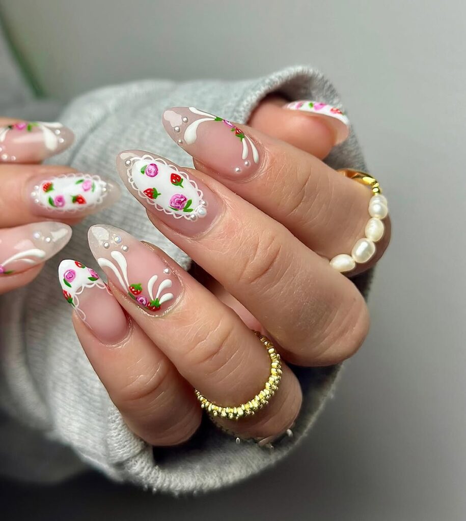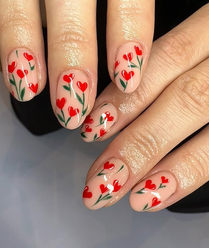 Small roses or delicate flowers on one or two accent nails. Keep them soft and watercolor-like rather than bold and graphic. Pair with a soft pink or nude base. This feels romantic and feminine without screaming Valentine’s Day.