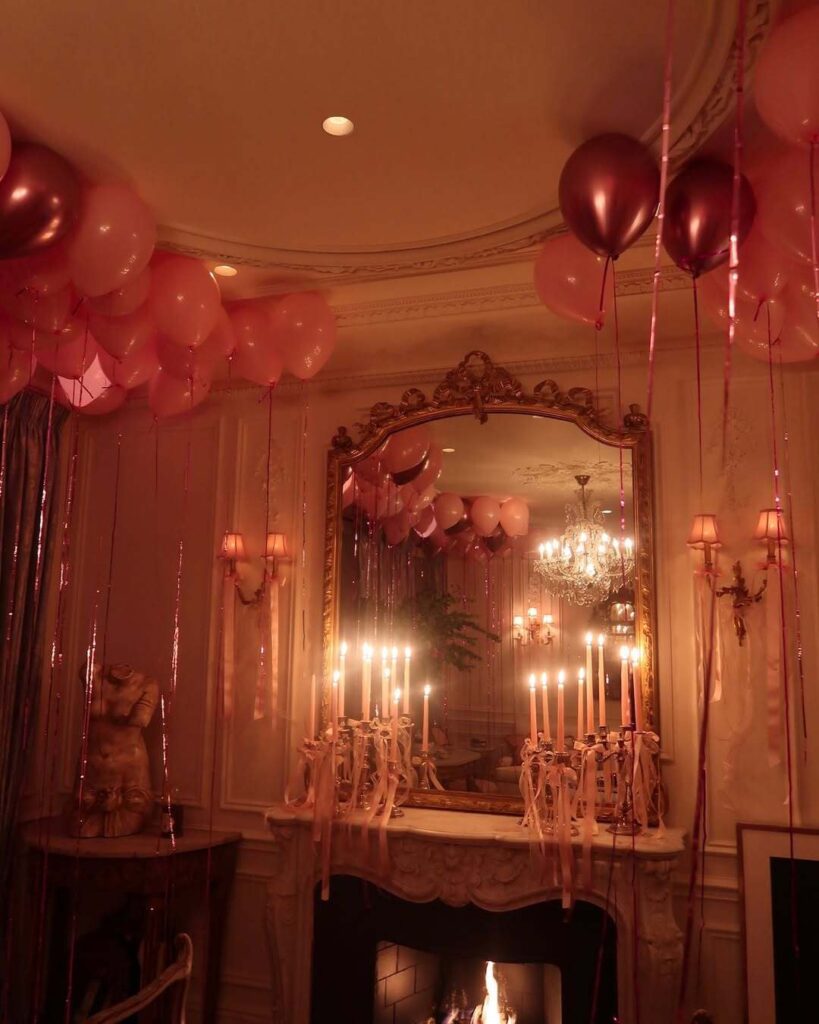 Create a Valentine’s vignette on a side table or mantle with vintage elements. Stack old books with romantic titles, add a vase with pink roses or carnations, include a vintage perfume bottle, scatter old Valentine cards, and add candlesticks with pink candles. Layer lace doilies underneath everything. It should feel collected and romantic rather than too coordinated.