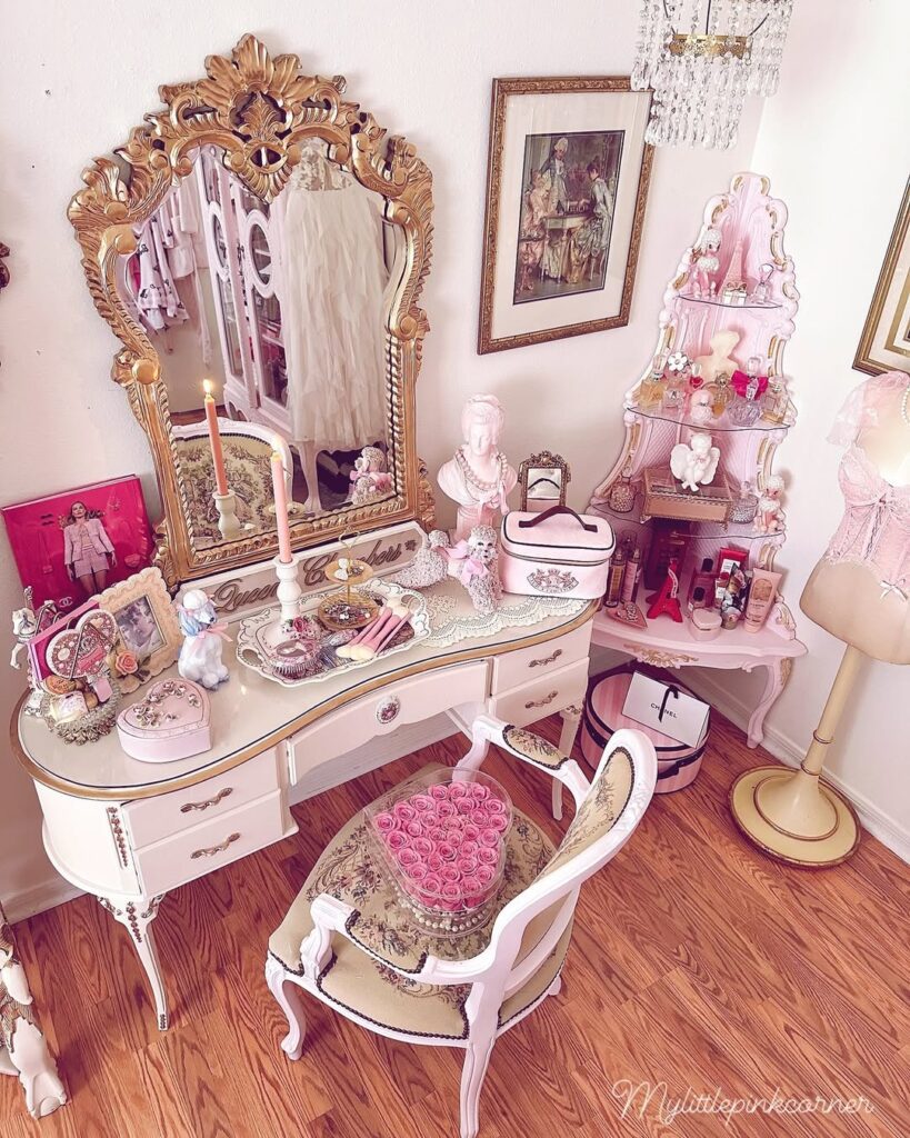 Vintage vanities or dressing tables are the epitome of this aesthetic. If you can find one, style it with a vintage mirror, pretty glass containers for jewelry, fresh flowers, and delicate accessories. Even a small desk styled this way creates that romantic vintage feeling.