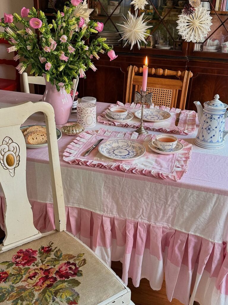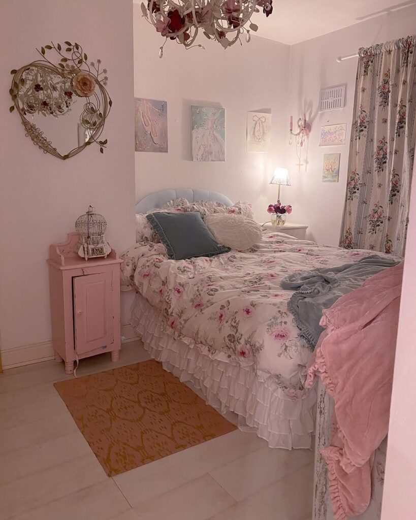 My bedroom is where I’ve fully committed to this aesthetic. Blush pink walls, white furniture, vintage floral bedding, a collection of pink glass on my dresser, lace curtains, and fresh flowers on my nightstand. It feels romantic and peaceful and completely me.