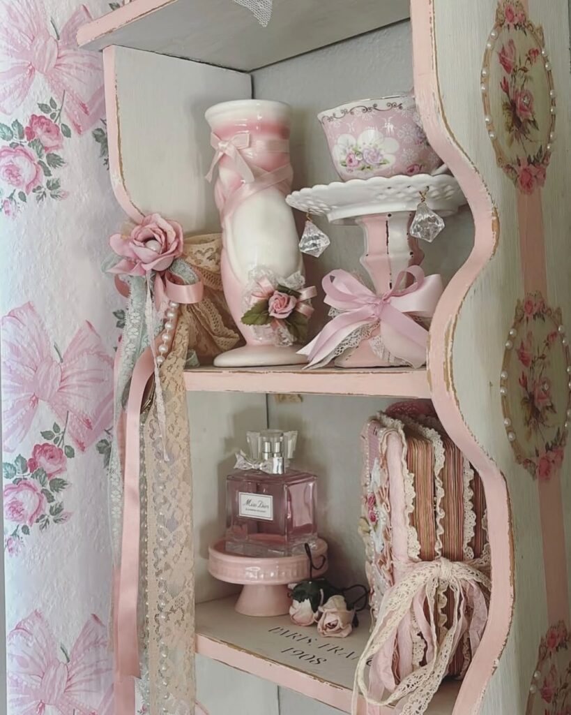 It’s cottagecore’s romantic older sister. It’s grandma’s china cabinet but make it intentional. It’s soft, feminine, and unapologetically sweet without being childish. The key is mixing vintage finds with intentional styling so it feels curated rather than cluttered.