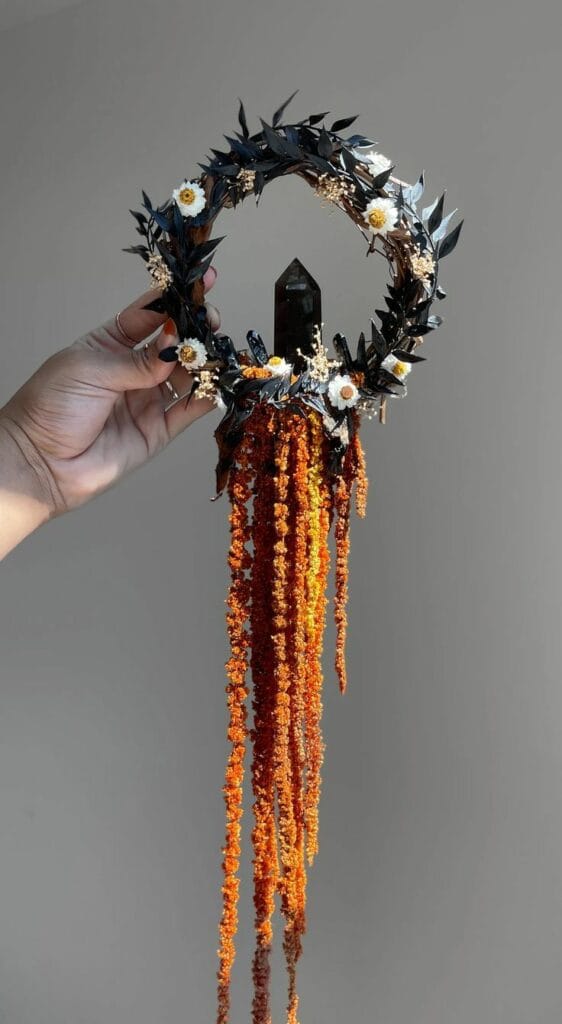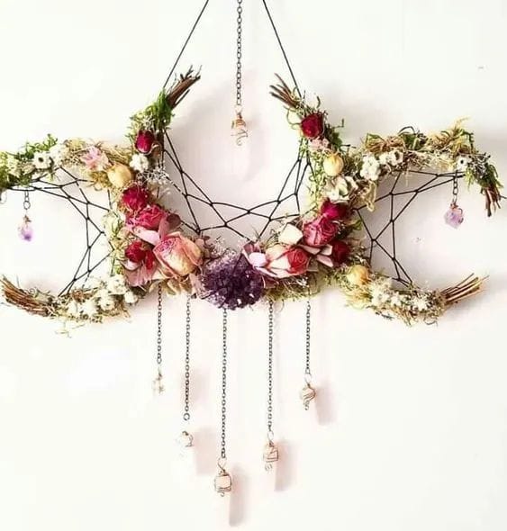 Celebrate your lunar connection with a moon-shaped wreath. Bend a wire frame into a crescent shape and adorn it with flowers, herbs, crystals, and ribbons that correspond to the moon’s energy. Display it in your sacred space to honor the cycles of the moon.